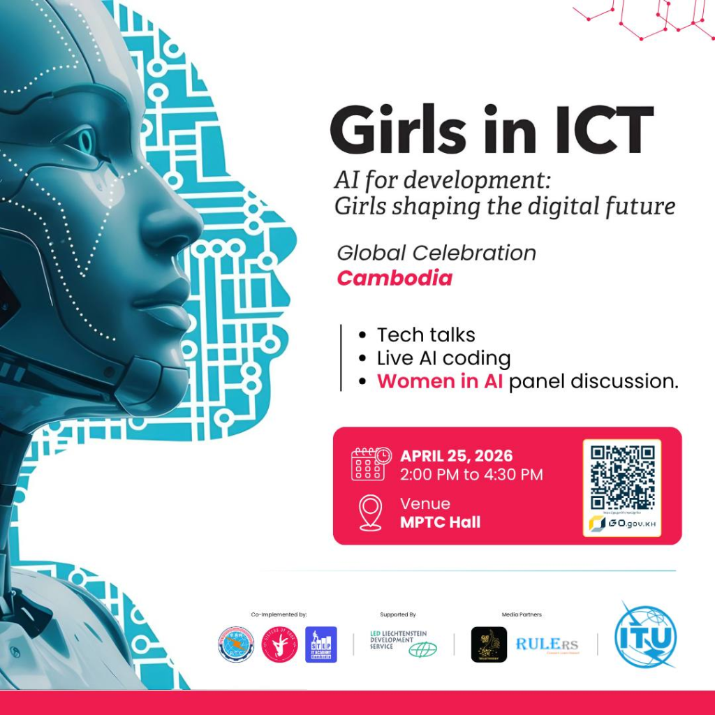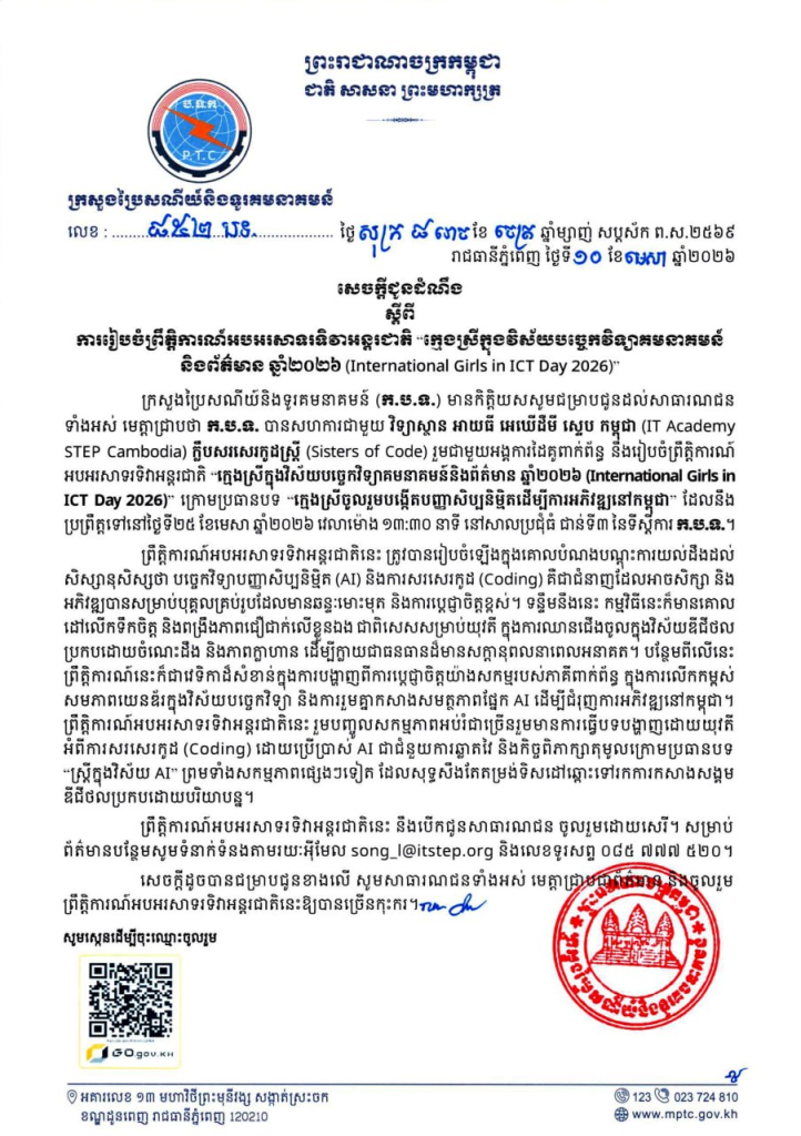 ក្រសួងប្រៃសណីយ៍និងទូរគមនាគមន៍ (ក.ប.ទ.) មានកិត្តិយសសូមជម្រាបជូនដល់សាធារណជនទាំងអស់ មេត្តាជ្រាបថា ក.ប.ទ. បានសហការជាមួយ វិទ្យាស្ថាន អាយធី អេឃើដឺមី ស្ទេប កម្ពុជា (IT Academy STEP Cambodia) ក្លឹបសរសេរកូដស្រ្តី (Sisters of Code) រួមជាមួយអង្គការដៃគូពាក់ព័ន្ធ នឹងរៀបចំព្រឹត្តិការណ៍អបអរសាទរទិវាអន្តរជាតិ “ក្មេងស្រីក្នុងវិស័យបច្ចេកវិទ្យាគមនាគមន៍និងព័ត៌មាន ឆ្នាំ២០២៦ (International Girls in ICT Day 2026)” ក្រោមប្រធានបទ “ក្មេងស្រីចូលរួមបង្កើតបញ្ញាសិប្បនិម្មិតដើម្បីការអភិវឌ្ឍនៅកម្ពុជា” ដែលនឹងប្រព្រឹត្តទៅនៅថ្ងៃទី២៥ ខែមេសា ឆ្នាំ២០២៦ វេលាម៉ោង ១៣:៣០ នាទី នៅសាលប្រជុំធំ ជាន់ទី៣ នៃទីស្តីការ ក.ប.ទ.។